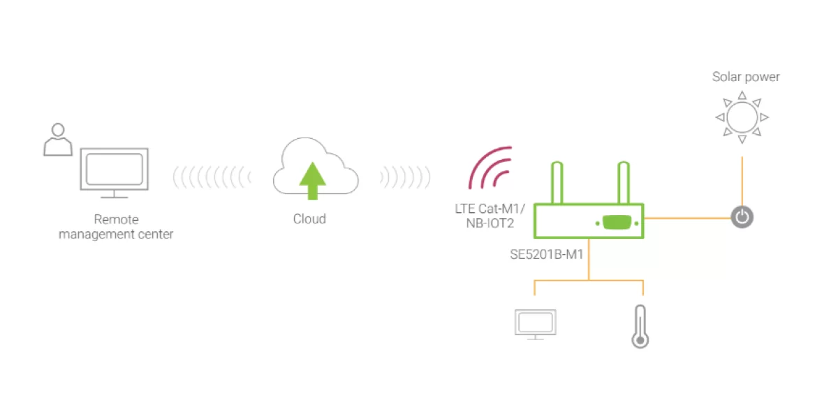 Low Standby Power Consumption The SE5201B-M1 is ideal for a wide range of low-throughput, ultra-low power consumption applications, including industrial sensors and smart metering, agriculture automation and more. These devices periodically wake up to transmit small amounts of data before returning to sleep mode. Designed with efficiency in mind, the SE5201B-M1 also helps you save on monthly ISP fee.
